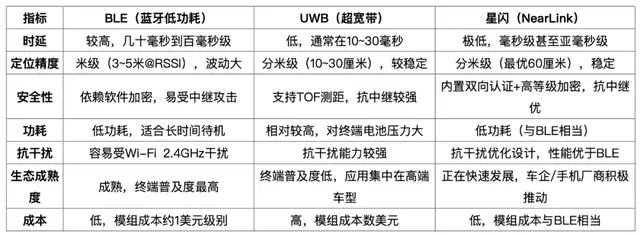 相比UWB,星闪技术的功耗和成本也都显著更低。作为必须随时可用的“系统常驻能力”,车端主锚点常年待机不会过度消耗电瓶电量;设备端在后台默默守护也不影响手机和手表续航。